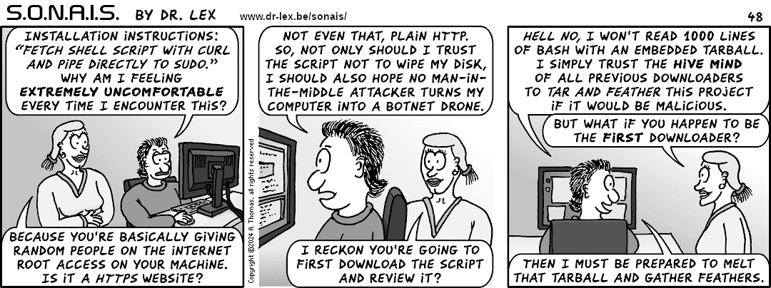 Max: Hell no, I won't read 1000 lines of Bash with an embedded tarball. I simply trust the hive mind of all previous downloaders to tar and feather this project if it would be malicious. Heidi: But what if you happen to be the first downloader? Max: Then I must be prepared to melt that tarball and gather feathers.