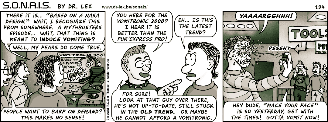 Random person: You here for the Vomitronic 3000? I hear it is better than the Puk'Express Pro! Max: Eh… Is this the latest trend? Random person: For sure! Look at that guy over there, he's not up-to-date, still stuck in the old trend. Or maybe he cannot afford a Vomitronic.