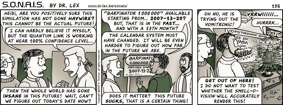 Alana: “Barfinator 1000000” available starting from… 2007-13-20? But, that is in the past… and with a 13th month? Heidi: The calendar system must have changed. It will be even harder to figure out how far in the future we are. Adil: Does it matter? This future sucks, that is a certain thing!