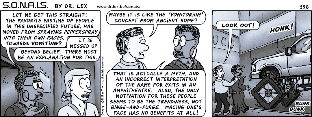 Setting: the team is back on the street. Alana: Let me get this straight: the favorite pastime of people in this unspecified future, has moved from spraying pepperspray into their own faces, towards vomiting? Heidi: It is messed up beyond belief. There must be an explanation for this.